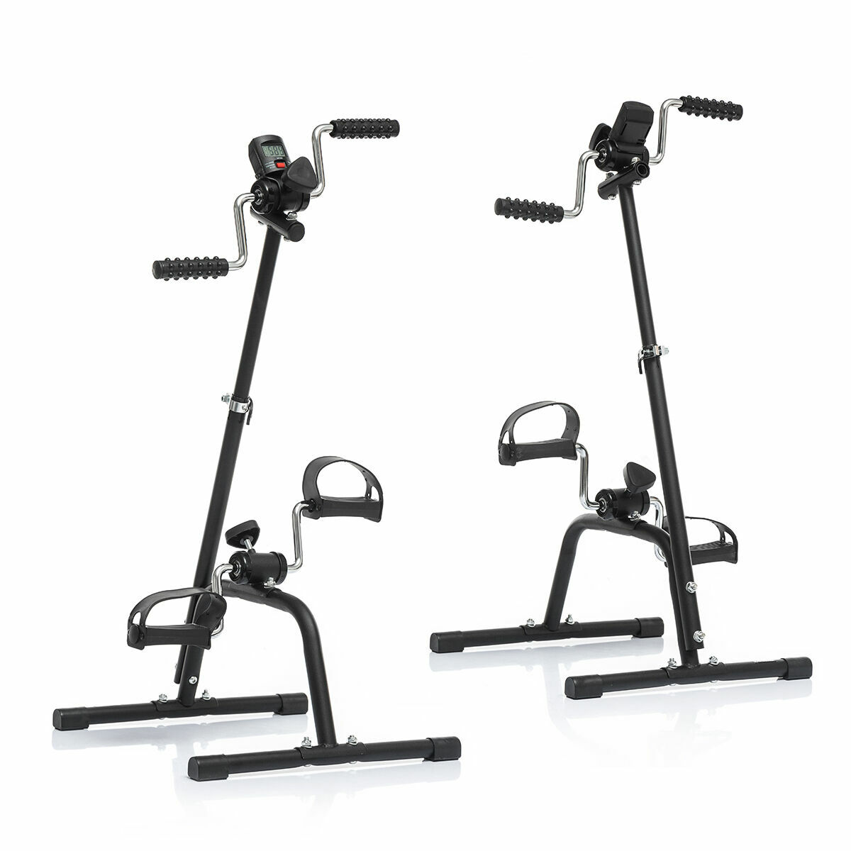 This mini dual pedal exerciser enables you to exercise your arms and legs comfortably while sitting down. It features a digital counter, adjustable height, non-slip feet, fastening straps on the pedals and exercise intensity adjuster. Ideal for the elderly.