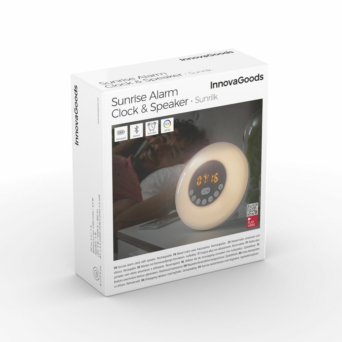 - Rechargeable, LCD screen, touch control: with its multifunction portable design, our rechargeable sunrise alarm clock with speaker offers endless possibilities: clock-alarm, BT speaker, radio and lamp. It has touch buttons and an energy saving option (low energy consumption). It includes a USB-C charging cable. Li-Ion battery 1200 mAh 4.5 W.
